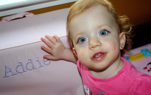 This has been a major month in Addie's development (as evident in this picture of one of her new "tricks" :)... we sat and made a list of all of the things she says/does. These are mainly for our benefit so I don't have to write them down. :)
